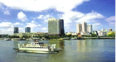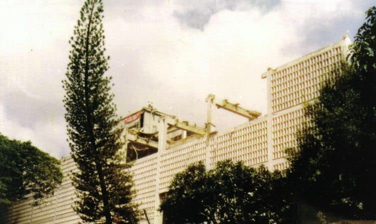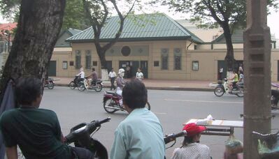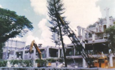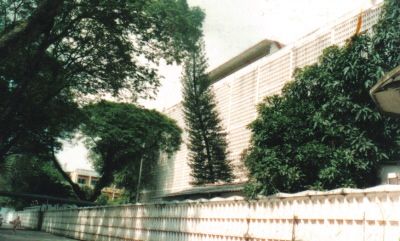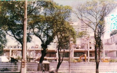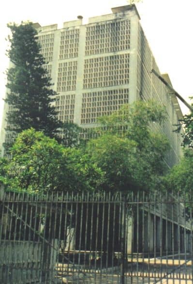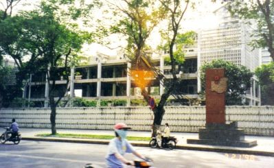 The U.S. Embassy before the start of demolition. The platform on the top was for the helicopters. The small bulding on the far left was for the Marine detachment. The hectic withdrawal of forces and people took place here at the end of the war on 30 April 1975. Up to the time of demolition it was used as an office building that contained also the Vietnam State Petroleum Authority. |