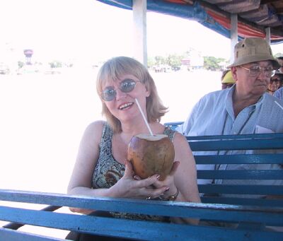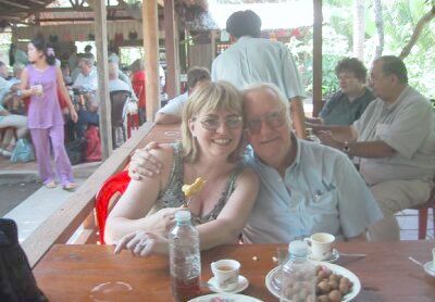A rare photo of the two of us together. Here just after having several types of fish snacks and drinks. This is at the end of the channel in the delta. |