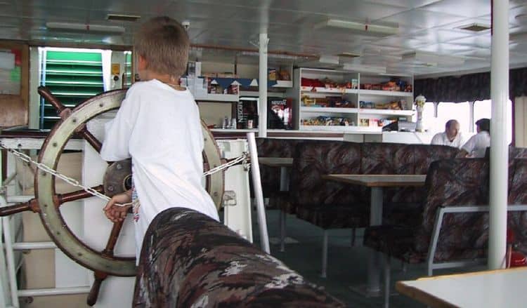 Another view in the main lounge bar. Note the aft steering rig, a joyful toy for the younger passenger. Again, click on the image for a larger view.