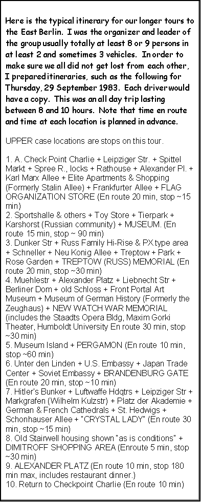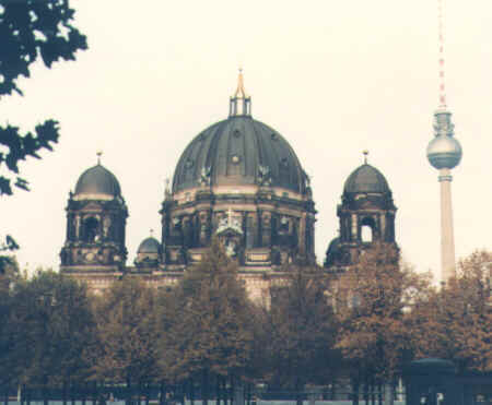The Church of Reconciliation, an Evangelical, on Bernauerstrasse is today no more. It was unfortunate that it lay in the no-man's land between the inner and outer walls. It was blown up by the East Germans in 1985. It was built in 1894 and could hold 1000 worshippers. It was badly damaged in WW2, but was restored and served as the parish church for the city's eastern sector until 1961, when the wall was started. We have walked in the cemetery behind the church, just to see what it was like. But, we were challenged by a border guard, who let us go after seeing our "East Passes."