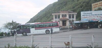 Our bus parked on the other side of the street in front of the restaurant at the top of the Hai Van Pass |