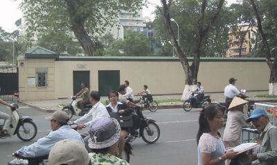 The U.S. Embassy before the start of demolition. The platform on the top was for the helicopters. The small bulding on the far left was for the Marine detachment. The hectic withdrawal of forces and people took place here at the end of the war on 30 April 1975. Up to the time of demolition it was used as an office building that contained also the Vietnam State Petroleum Authority. |