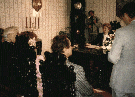 Above, Danuta, signing the wedding register, while on the left, the Polish to English translator talks to Lester and the Wedding Minister looks on. On the right, Danuta is checking out the ring on Lester's "left" hand. (In Europe the couple wear the rings on the right hand.) |
