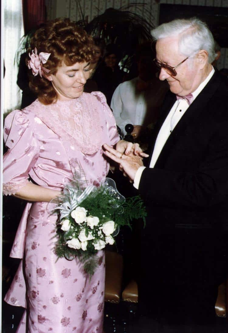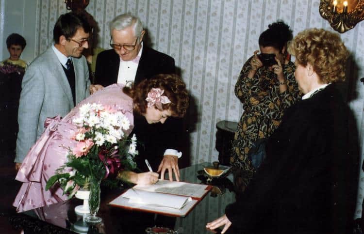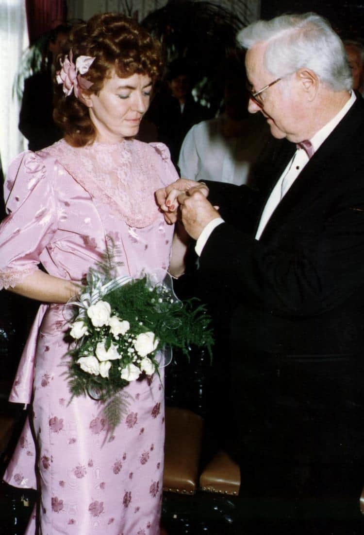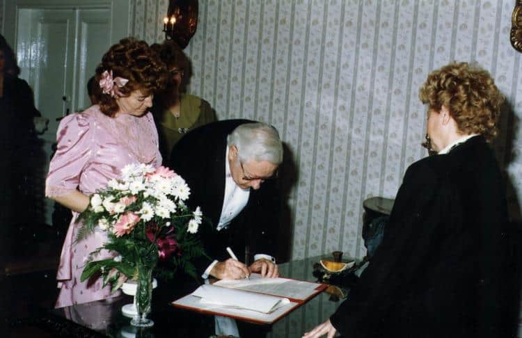Above, Lester, signing the wedding register, while on the left, Danuta carefully supervises and the Wedding Minister looks on. On the left photo, Danuta is receiving her ring from Lester on her "left" hand. (In Europe the couple wear the rings on the right hand.) |