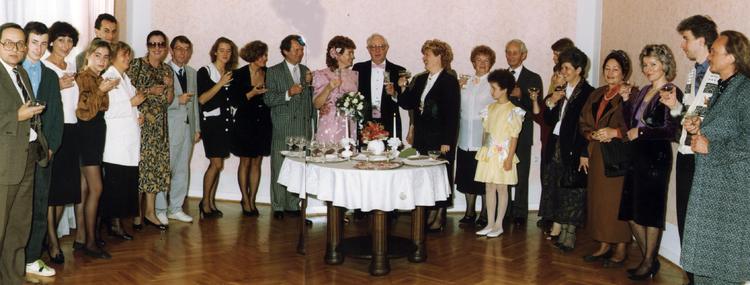 Above photo shows most of the people who attended the wedding service at the Champagne Reception following the ceremony. This was followed by a further reception party with hors d'oeuvres and, yup, more bottles of champagne. There was a three piece band playing all the music. |